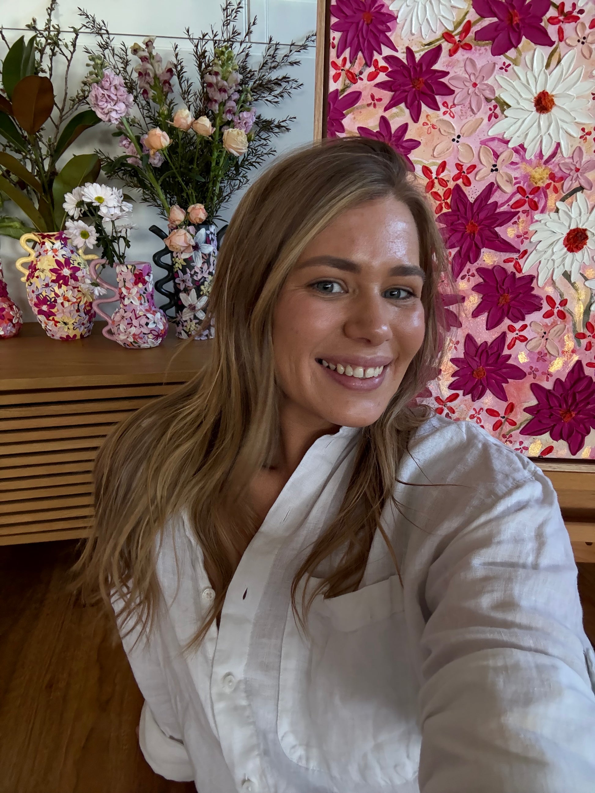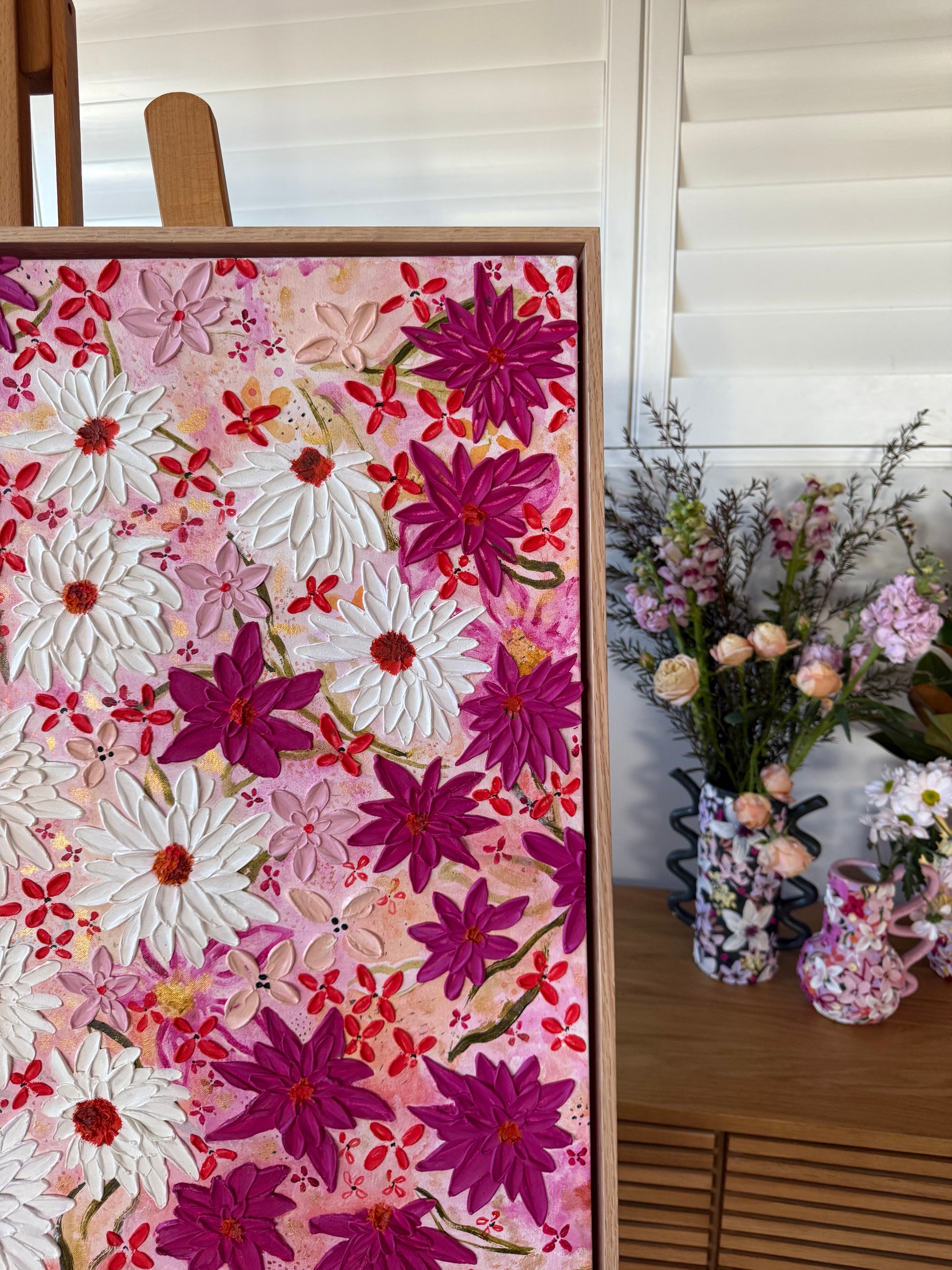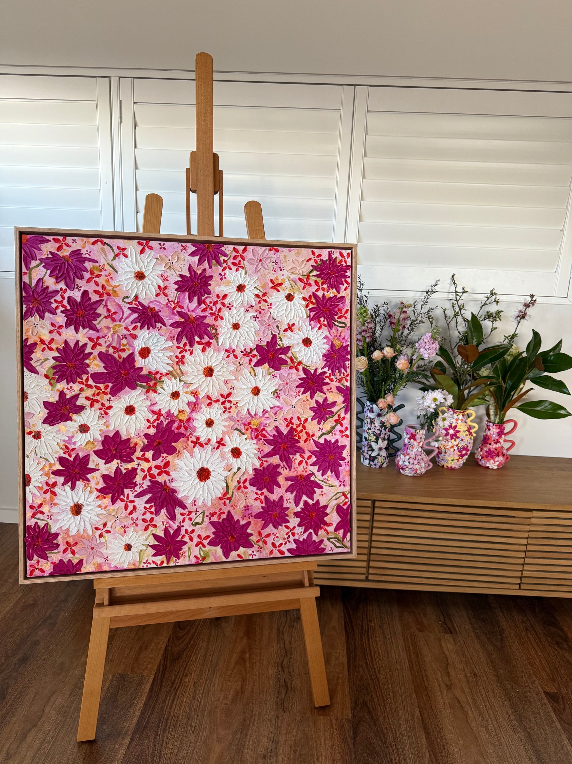 This piece carried defiance in every petal. Layers of bold magenta and crisp white blooms spread unapologetically across the canvas, a visual retort to the idea that someone else's words can define your truth. If she said so is a revenge piece - proof that repetition doesn't make a story real, and that strength blooms louder than any rumour.