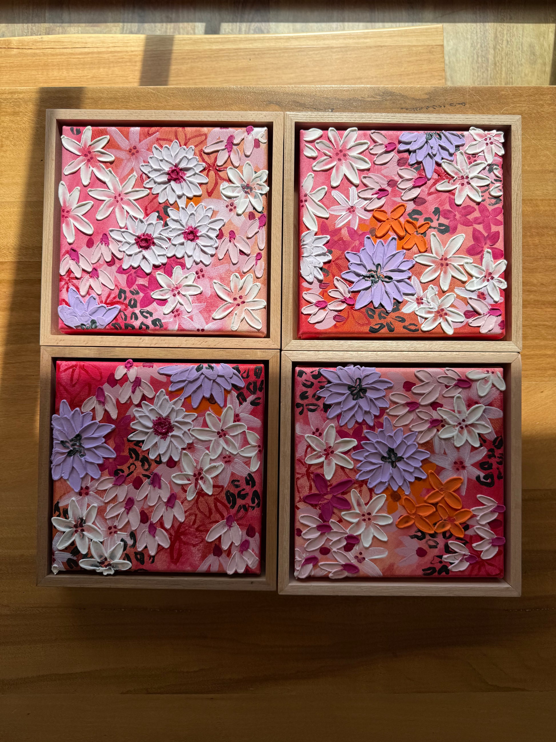 four 20x20cm mixed media on stretched canvas framed in flooded gum,
